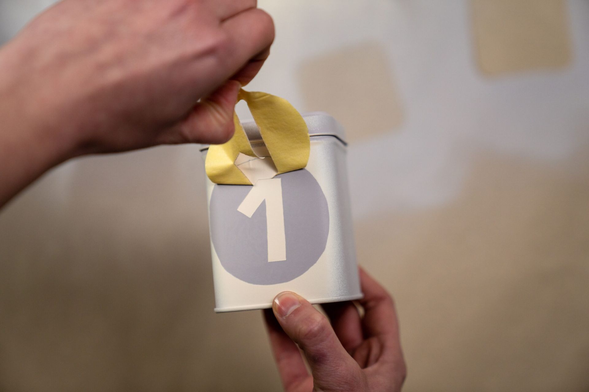 Z lepicí pásky vystřihněte šablony s čísly a po zaschnutí barvy je nalepte na dózu. Dbejte přitom na to, aby šablona na povrch dobře přiléhala a barva pod ni nezatekla. Číslo přestříkejte sprejem v druhém odstínu a nechte zaschnout 5–10 minut. Pak můžete pásku opatrně sloupnout.