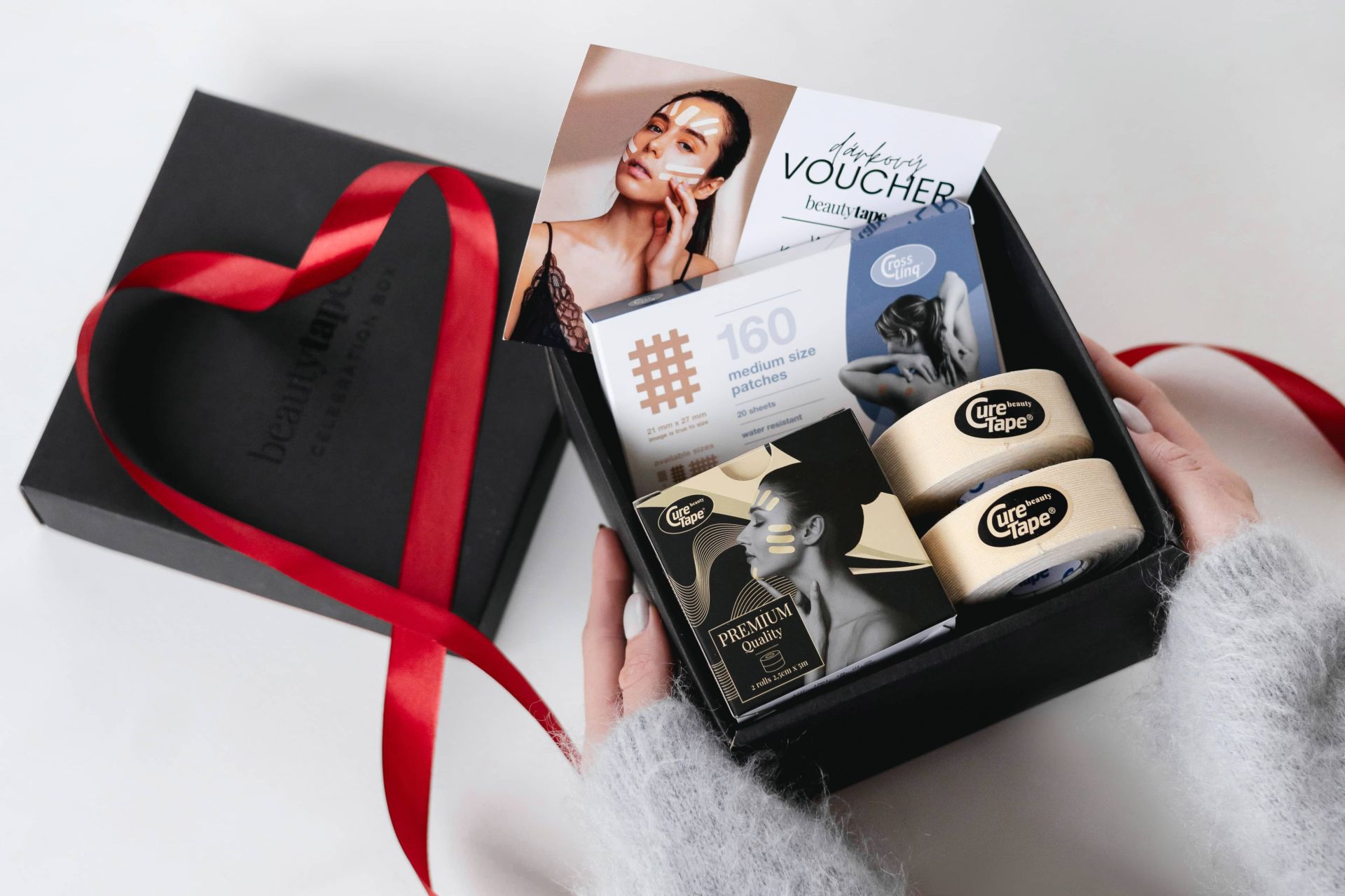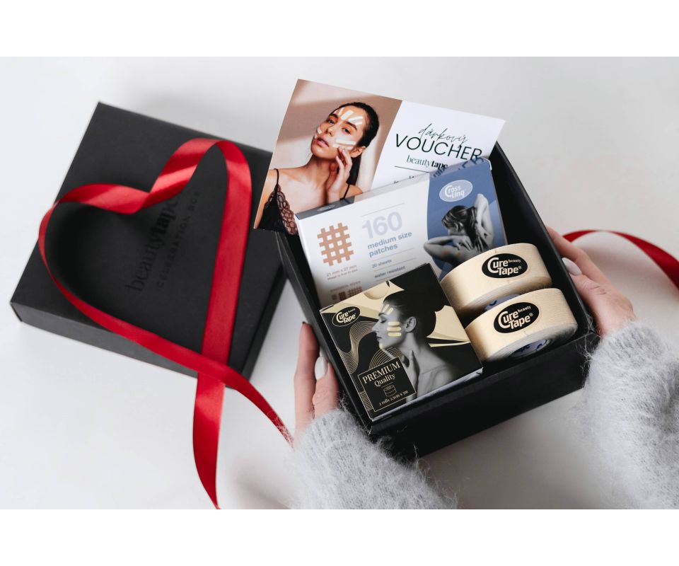 Limitovaný Celebration Box je originální dárek pro každého, kdo chce objevit svět kosmetického tejpování. Obsahuje certifikovaný tejp CureTape® Beauty široký 2,5cm, bestseller náplasti CrossLinq® a voucher na online kurz, který obdarovaného provede technikou tejpování jednoduše a krok za krokem. Vše je zabaleno v elegantní dárkové krabičce, připraveno potěšit každého beauty nadšence, ale i úplné začátečníky.