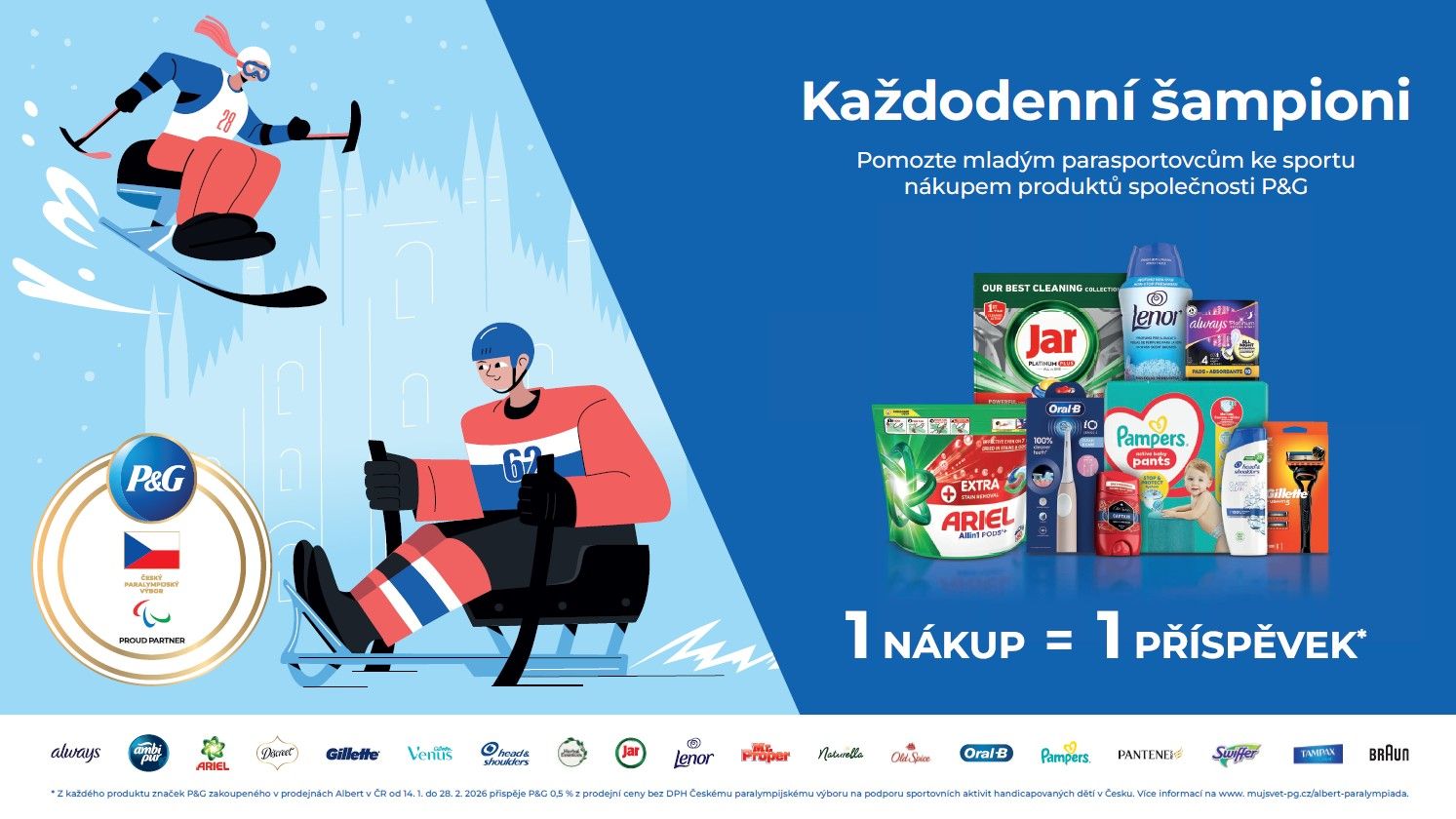 Podpořit projekt můžete i vy. Stačí si od 14. ledna do 28. února koupit jakýkoli produkt Procter & Gamble v prodejnách Albert, část z vašeho nákupu automaticky poputuje na podporu dětského parasportu.