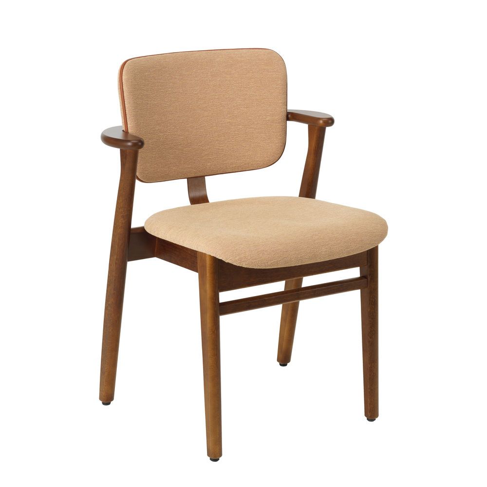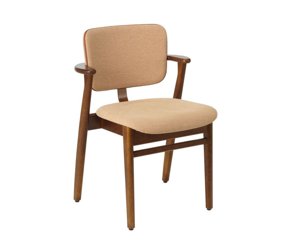 Domus Chair je dostupná v základním dřevěném provedení nebo s čalouněním pro vyšší komfort. Nová kolekce látek a kůží s jemným kontrastním lemem podtrhuje její univerzálnost. Barevná paleta částečně vychází z původních vzorníků, které Tapiovaara sestavoval pro své interiérové projekty.