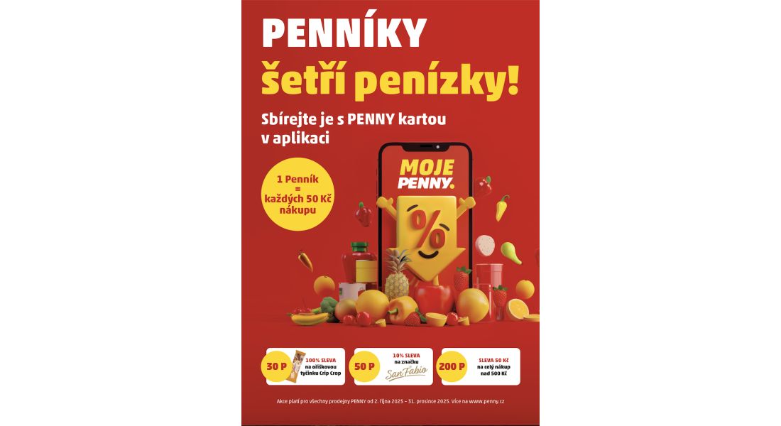 Od 2. října do 31. prosince 2025 nabídne PENNY svým zákazníkům nový způsob, jak z každého nákupu získat víc. Projekt PENNÍKY funguje jednoduše: při placení s digitální PENNY kartou v aplikaci MOJE PENNY se za každých 50 korun automaticky připíše jede...